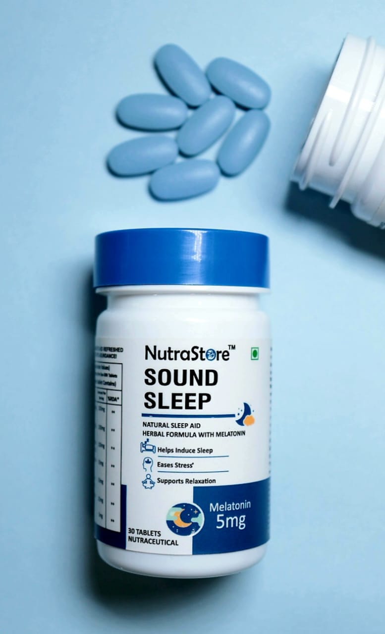 NutraStore Sound Sleep is a specialised sleep support formula created to improve your sleep cycle and promote deep sleep. Each tablet contains Melatonin 5mg along with six calming herbs: Brahmi, Tagar, Jatamansi, Passion Flower, Chamomile and Ashwagandha to support relaxation, reduce stress and enhance overall sleep quality for men and women.